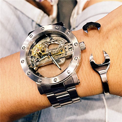 -. Feature : GuTe Steampunk Mechanical Watch Unisex Adult Style / Minimalist Mechanical Watch Steampunk Designs / Silver Tone Bezel with Slotted Screw Stainless Steel Watchband fold over clasper / ?Power by Shaking the Watch made the Rotor automatically wind up & Unscrew the Crown and downward Turns for Set Time / Made by IK colouring High Quality Mechanical Watches