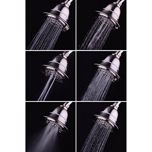 SHOWER HEAD: 6 Full Setting Shower Head. Settings include Pulsating Massage, Stay-Warm Mist, Rain/Massage, Rain/MIst, Mist/Massage, Water-Saving Economy • Extra-Large 5-Inch Brushed Nickel Face • 3-zone Click Lever Dial • Rub-clean Jets • Angle-adjustable • SpiralFlo Design
