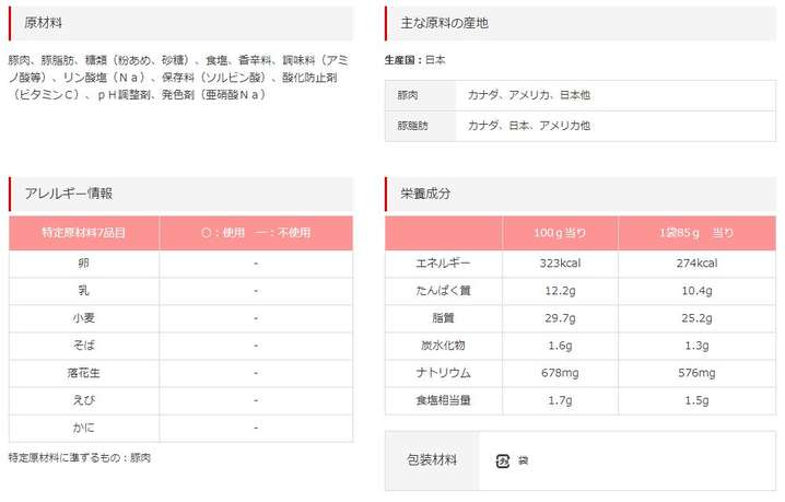 ●豚肉、豚脂肪、糖類(粉あめ、砂糖)、食塩、香辛料、調味料(アミノ酸等)、リン酸塩(Na)
