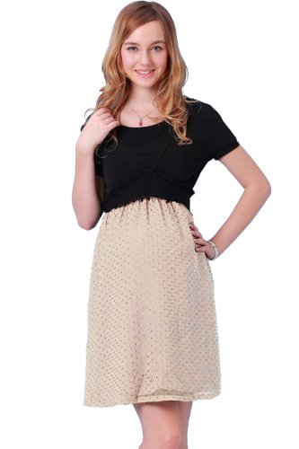 The dress which is pired simple tops with A-line skirt. Its top made from ester and ciffon weaved dobby bring a nice balance. The cute mini frill is on waist line. It does not look like nursing wear, but it is useful for all mothers.