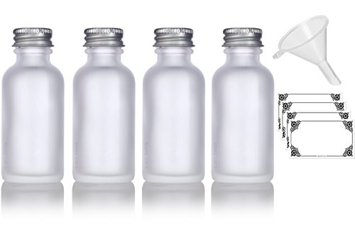 1 oz Frosted Clear Glass Boston Round Silver Screw On Cap Bottle (4 pack) + Funnel and Labels for cosmetics, serums, essential oils, aromatherapy, food grade, bpa free