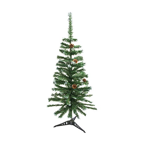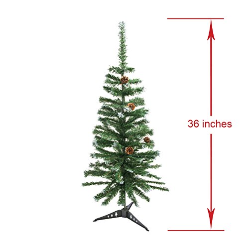 Get into the holiday spirit with this luscious ALEKO Christmas tree and decorate your home with holiday cheer. Our premium artificial tree is made out of dense PE needles, giving it that fresh cut look that will last all season. The tips are sculpted to enhance the lifelike appearance, and the staggered branches create a fuller profile. No more messy needles, sap, or spilled water. It's quick and easy to set up and creates a warm holiday environment. The tree is 3 feet tall, has 90 pieces of beautiful pine tips, with white ends, sprinkled on like snow , and is decorated with 6 pine cones. Great for indoor and some outdoor use. Decorate any room in your home or office. Bring joy and warmth into this holiday season for you and your friends and family to enjoy. It comes with a green plastic stand. Our trees are of great quality, making it your best choice. Terrific value. Fast Shipping. 3 feet tall. 90 Tips.6 Pine cones.Feature