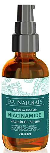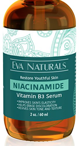 -. Binding : Misc. -. Brand : Eva Naturals -. Feature : Hydrates and moisturizes the skin. / "Niacinamide is known to have effectiveness on sallowness, wrinkling, red blotchiness and hyperpigmented spots in aging skin." (The Journal of Dermatology). / Mitigates acne, improves skin elasticity, helps erase discoloration, revives skin tone and texture. / Another form of vitamin B3 an essential element of cellular energy production. Naturally produced, in small amount by the body, and found in foods like nuts, fish, certain breads and cereals. / Made in USA, cruelty free, paraben and alcohol free. -. Label : Eva Naturals -. Manufacturer : Eva Naturals -. Model : ENNS02 -. MPN : ENNS02 -. NumberOfItems : 1 -. PackageQuantity : 1 -. PartNumber : ENNS02 -. ProductGroup : Beauty -. ProductTypeName : BEAUTY -. Publisher : Eva Naturals -. Studio : Eva Naturals -. Title : Niacinamide Vitamin B3 5% Serum - Anti Aging, Anti Wrinkle Mostiurizer Cream Serum by Eva Naturals