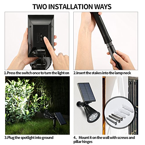[INSTANTLY LIGHT UP YOUR LANDSCAPE]: With 2 install ways, you can place these solar spotlights at anywhere direct under the sun outside. Perfect for lighting up your trees, Patio, Porch, Path, Deck, Yard Garden, Garage, Driveway and so on. Make your home with lighting at night Immediately!