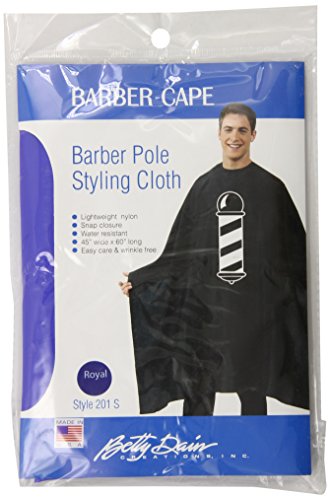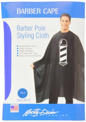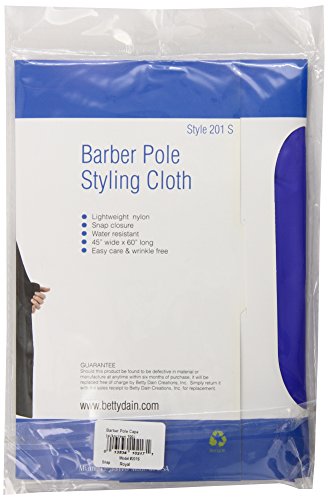 Studio : Betty Dain Creations, Inc. Publisher : Betty Dain Creations, Inc. Binding : Health and Beauty Product Description Betty Dain's Barber Pole hair cutting cape features a black-and-white classic barber pole silkscreened graphic to accent to any environment. This cape is water resistant and made of a lightweight nylon for added comfort. The convenient snap closure at the neck and generous 45" x 60" size ensures clients remain protected and comfortable during styling appointments. Machine washable. Designed and manufactured by Betty Dain, which has listened to the needs of the beauty industry and created high-quality solutions for over 60 years. 0