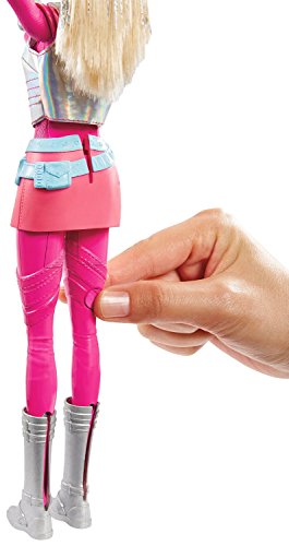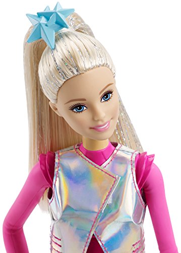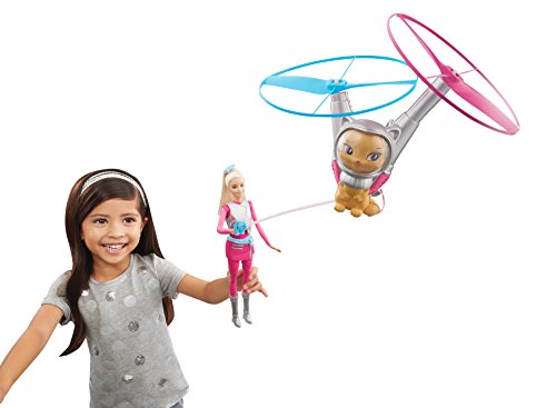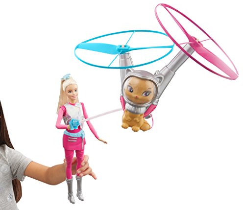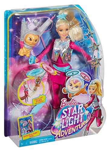 Based on the space fantasy movie Barbie Star Light Adventure, galaxy Barbie doll and her flying cat take storytelling out of this world! Join them and travel through a galaxy of sparkling stars and colorful characters. Recreate the exciting action of these two companions, who embark on an adventure throughout the galaxy -- training, traveling and saving the universe together. Barbie doll's cat really flies to mimic the high-flying fun! Attach the cat's leash to Barbie doll's hand, and push the button on Barbie doll's leg to spin the propellers on her cat. Watch the adorable animal lift into the air and begin to hover, raising the possibilities for excitement and storytelling! The star of the movie, Barbie doll, is ready for action in her signature pink molded jumpsuit. A shiny holographic vest, pink plastic skirt (with cool zipper details), blue utility belt and silvery boots are fashion-forward accessories. Silver streaks and a blue star hair clip atop her ponytail complete her look. Her cute cat matches with a silvery helmet (non-removable) and two pink-hued propellers. Recreate favorite scenes from the movie or let your imagination soar! Galaxy Barbie doll and her flying cat are ready to lift off into fun. Collect all of the dolls and accessories from Barbie Star Light Adventure to expand the storytelling possibilities to the ends of the universe (each sold separately, subject to availability). Includes Barbie doll wearing fashions and accessories and her flying cat with non-removable helmet and leash. Doll cannot stand alone. Colors and decorations may vary.Feature
