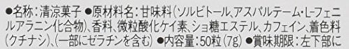 원재료:감미료(솔《비토루》,아스 PAL《데무》L-회《니루아라닌》화합물)고, 향료,미립 산화 규소,《쇼》당 에스테르,카페인,착색료(치자나무)고,(원재료의 일부에 젤라틴을 포함한다)