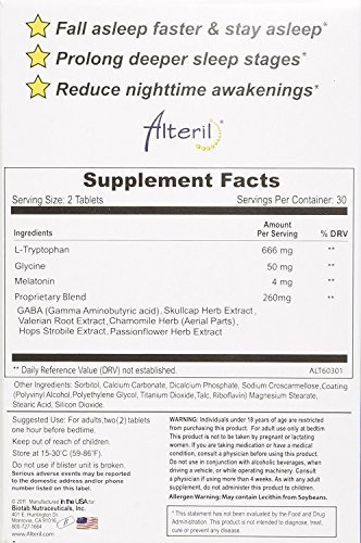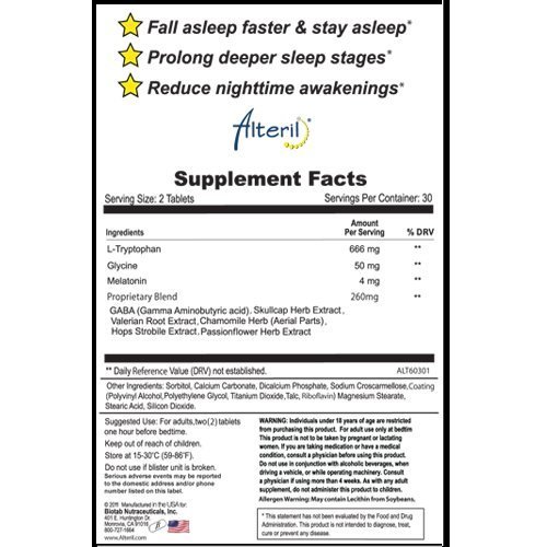 Studio : Biotab Nutraceuticals Publisher : Biotab Nutraceuticals Binding : Health and Beauty Product Description Alteril is a premium grade sleep aid that may help you get the sleep you need without the unwanted side effects you may not want. The primary ingredient in Alteril has been used for years to get good, sound, restful sleep. When taken as directed, Alteril has not been demonstrated to show dependency or side-effects of prescription sleep aids. Don't suffer from sleep problems . . . consider Alteril. Alteril helps you sleep safely and gently without a risk of addiction. Alteril can gently cause you to fall asleep when you want to. Millions of people all over the world have used the primary ingredients of this completely safe, non-habit forming formula for years to get good, sound, restful sleep with no harmful side-effects. Many people have found that they prefer natural sleep aids because they often work better with fewer side effects than prescription sleeping pills. 0