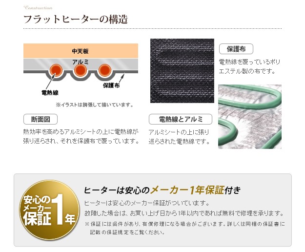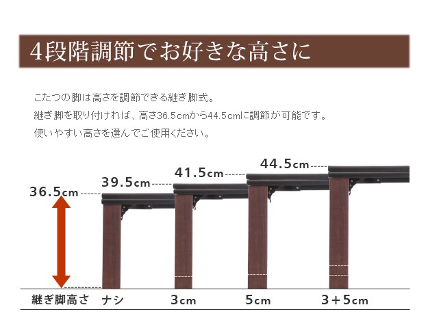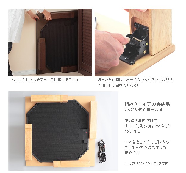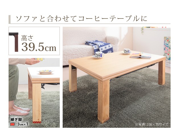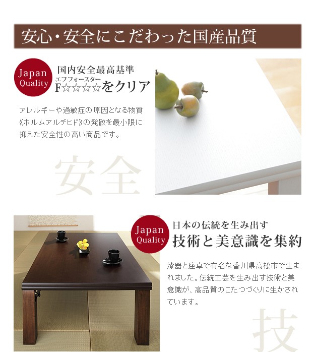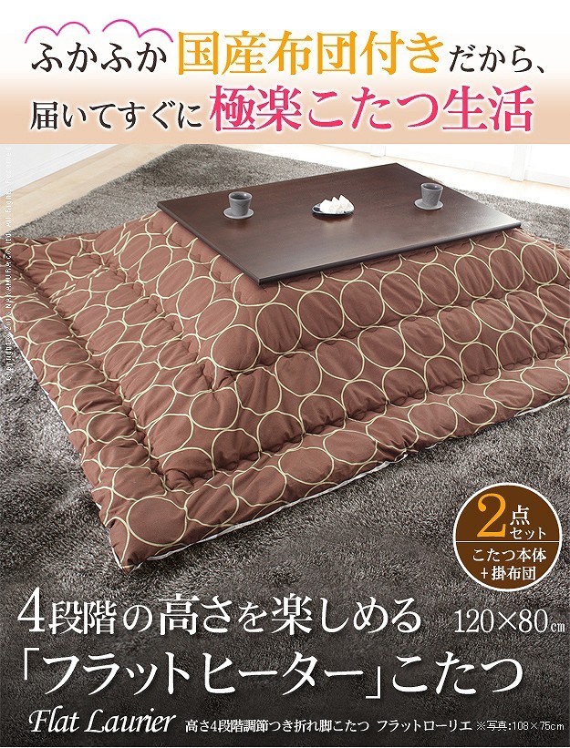 商品について:楢天然木の木目が美しい日本製のこたつと色柄豊富なこたつ布団のセット。でっぱりのないフラットヒーターなので、足元は広々。ムラなく隅々まで均一に暖まります。見た目も普通のローテーブルのよう♪ヒーターを気にせず1年を通してお使いいただるデザインです。継ぎ脚が付いて便利☆お好みの高さに調節できます。折りたためば厚さわずか約14cm!ちょっとした隙間にも収納OK。