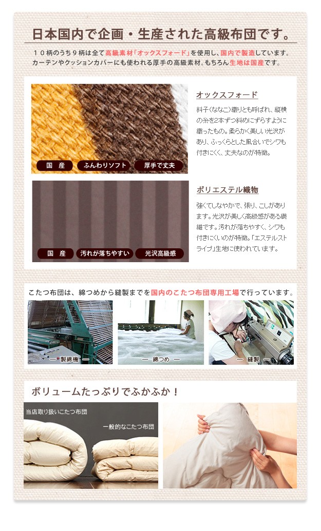 こたつ布団は丈夫な国産生地を使用し、国内工場で綿入れ・縫製をしました。ボリュームたっぷり!すみまでしっかり綿が入ったこたつ布団です。