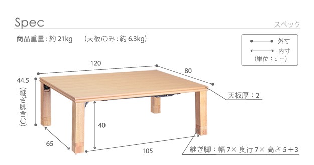 サイズ(cm):幅120x奥行80x高さ44.5cm(36.5+継ぎ脚5cm+継ぎ脚3cm)・約21kg、布団-幅205x奥行245・約2.5kg