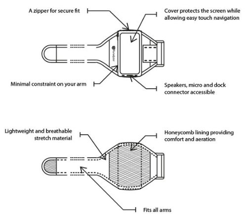 -. Feature : Compatible with all iPhone and iPod touch / Lightweight and breathable stretch material / A zipper for a secure fit / All connectors accessible / Cover protects device screen while allowing easy navigation