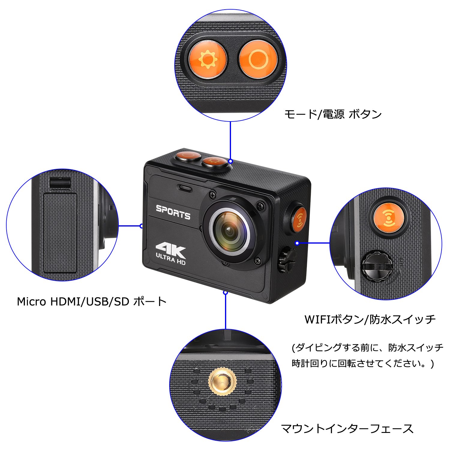 Please rotate the waterproof switch clockwise before diving.