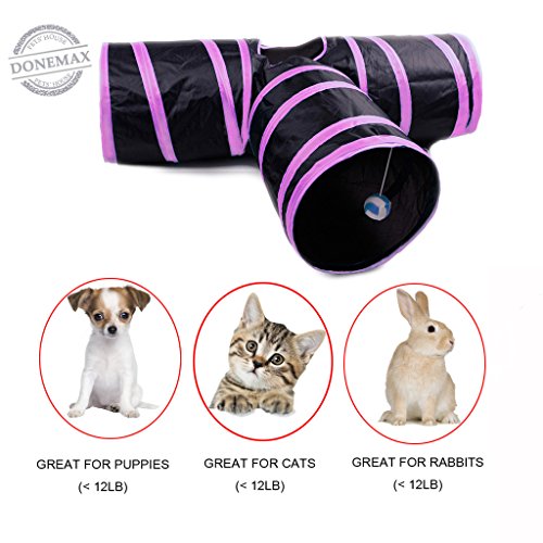 Studio : Donemax Publisher : Donemax Binding : Misc. Product Description One Fun and Healthy Way for Engaging Cat's Natural Instinct to Hide and Seek. Features - Three tunnels in one - more entertaining for your cat or kitten. - Hanging ball toy increases cat's sensitivity flexibility. - Features peep hole in middle. - Durable polyester fabric material, not easy to deform. - Waterproof design, doesn't stick hair, for convenient cleaning-up. - Strong sprung-steel frame with protective ends. - Collapsible and lightweight for easy travel storage.