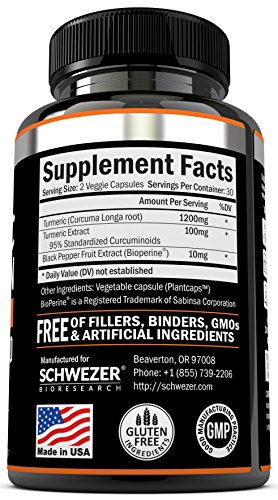 -. Binding : Health and Beauty -. Brand : Schwezer Bioresearch -. EAN : 0737212751122 -. Feature : 100% SATISFACTION GUARANTEE: Feel the difference or your money back, no questions asked! / SUPERIOR QUALITY TURMERIC CAPSULES ENHANCED WITH BIOPERINE: Schwezer turmeric formula has 1300mg of Turmeric Curcumin with 95% Standardized Curcuminoids and 10mg of BioPerine (black pepper, curcumin with black pepper) for enhanced absorption and bio-availability. / ALLERGEN FREE, NON-GMO, FILLERS, BINDERS OR PRESERVATIVES: Our professional grade turmeric with bioperine (curcumin with bioperine) is natural turmeric powder and has better absorption than turmeric tea. Our Curcumin is also FREE Of gluten, soy, milk, egg, shellfish, corn, wheat, and peanuts. / DOCTOR FORMULATED MADE IN USA TURMERIC PILLS: Our Turmeric Extract is formulated by doctors and manufactured in the USA in a FDA-approved facility following strict GMP guidelines. Our turmeric with bioperine is third Party Tested to assure the highest quality and purity of each batch. / HIGHEST QUALITY INGREDIENTS: Not only is our tumeric curcumin supplement more potent, we use patented BioPerine (10mg per serving) for increased absorption and bioavailability. Turmeric with black pepper is essential in good curcumin supplements (turmeric supplement). We only use pure and raw ingredients in all our formulas. -. IsAdultProduct : 0 -. Label : Schwezer Bioresearch -. LegalDisclaimer : These statements have not been evaluated by the Food and Drug Administration. This product is not intended to diagnose, treat, or cure any disease. -. Manufacturer : Schwezer Bioresearch -. MPN : SB-TUR-60 -. PackageQuantity : 1 -. PartNumber : SB-TUR-60 -. ProductGroup : Health and Beauty -. ProductTypeName : HEALTH_PERSONAL_CARE -. Publisher : Schwezer Bioresearch -. Size : 60 count -. Studio : Schwezer Bioresearch -. Title : Turmeric Curcumin with Bioperine. Highest Quality Anti-inflammatory Supplement with Black Pepper. Pain Relief & Joint Support with 95% Standardized Curcuminoids. Non-GMO, Gluten Free Turmeric Capsules -. UPC : 737212751122