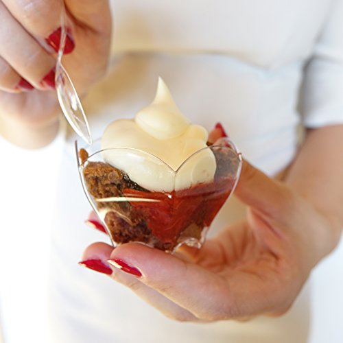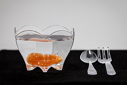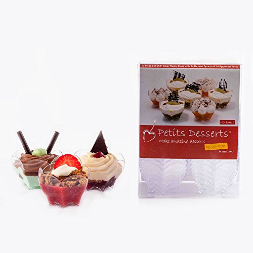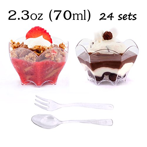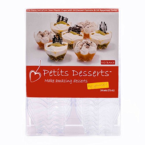 INCLUDED in ONE PACK: ? Recipe e-book with (20 recipes for desserts in cups) ? 24ct Small dessert cups size: 2.3oz (70ml), height: 1.66'(4.2 cm), diameter: 2.5' (6.3 cm) ? 24ct Small tasting spoons, 3.74" (9.5 cm) ? 24ct tasting forks, 3.74" (9.5 cm) ? All in clear color