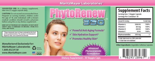 PhytoRenew 350 contains an advanced Phytoceramide formulation with 5000 IU of Vitamin A, 60 mg of Vitamin C, 400 IU of Vitamin D, 30 IU of Vitamin E, and 350 mg of Phytoceramides per veggie capsule. Phytoceramides are plant-based lipids that promote healthy skin and support optimal hydration levels that protects the skin's surface. This potent anti-aging formula is designed to aid the health and structural integrity of the skin.Feature