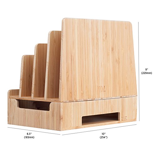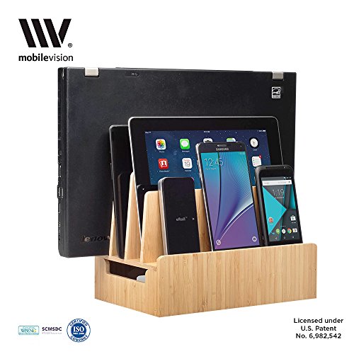 New slimmer version of the top-rated MobileVision Bamboo Charging Dock for multiple devices and tech gadgets allows you to organize your laptop, multiple tablets, and at least 3 smartphones while they charge. Ideal for clearing up necessary desktop and countertop space.