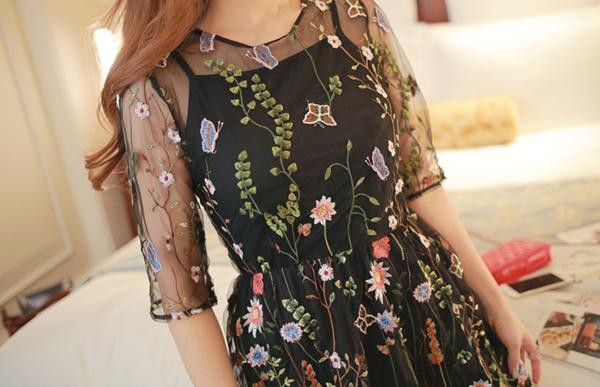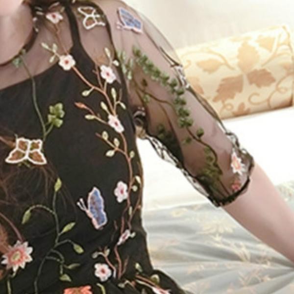 花柄 刺繍 レース シースルー 黒 ロング