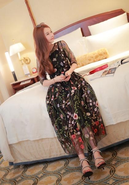 ☆シースルーの生地に花柄の刺繍を沢山入れ込んだシースルー マキシワンピースです。これからの季節に最適なアイテムです☆