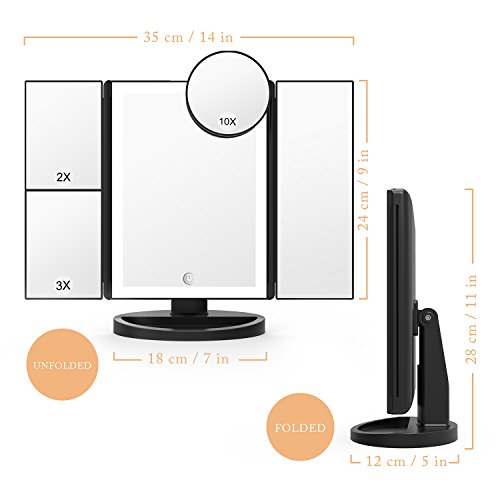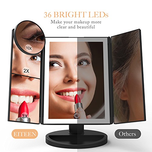 -. Feature : LED Strips All-around : Built in 36 pcs LED lights, improved over similar products with 21 or less LEDs , offering bright but Even Lighting, and could be adjustable by gently touching the small button / Dual Power Supply: Smartly power the mirror using the included USB cable or 4 AAA batteries ( battery not included, usb wire included) / 10X 3X 2X 1X Magnification: Multiple levels of amplifications for precise makeup applications on the eyes, lips, cheeks, and final touches / 180°Swivel Rotatable: 3 Foldable panels featuring a 180° rotatable base help present your beauty from any perspective and see every minor detail up-close / A Complete Beautiful Set: Contains 1 x Black Tri-Fold Mirror, 1 x 10X Magnification Spot Mirror, 1 x Micro USB Charging Cable, covered by a 60- day money back