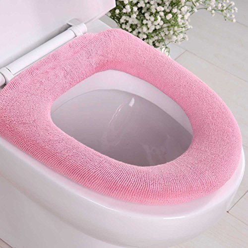 -. Feature : Warm, cozy and comfortable, no more cold potties . / Thick, quality and stretchable material that fits well on oval and round toilets . / To install: place cover with ring facing underside of toilet seat, pull cover through the hole, then stretch cover over toilet seat. / Three pretty colors: beige, blue and pink. The colorful packaging makes them wonderful and thoughful gifts. / Portable , washable(please take the plastic ring out before washing) and reusable .