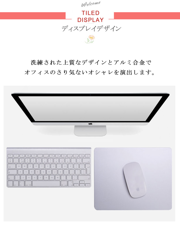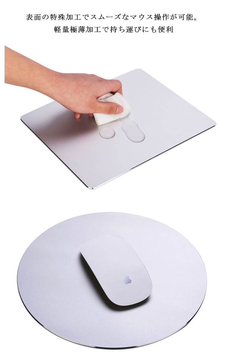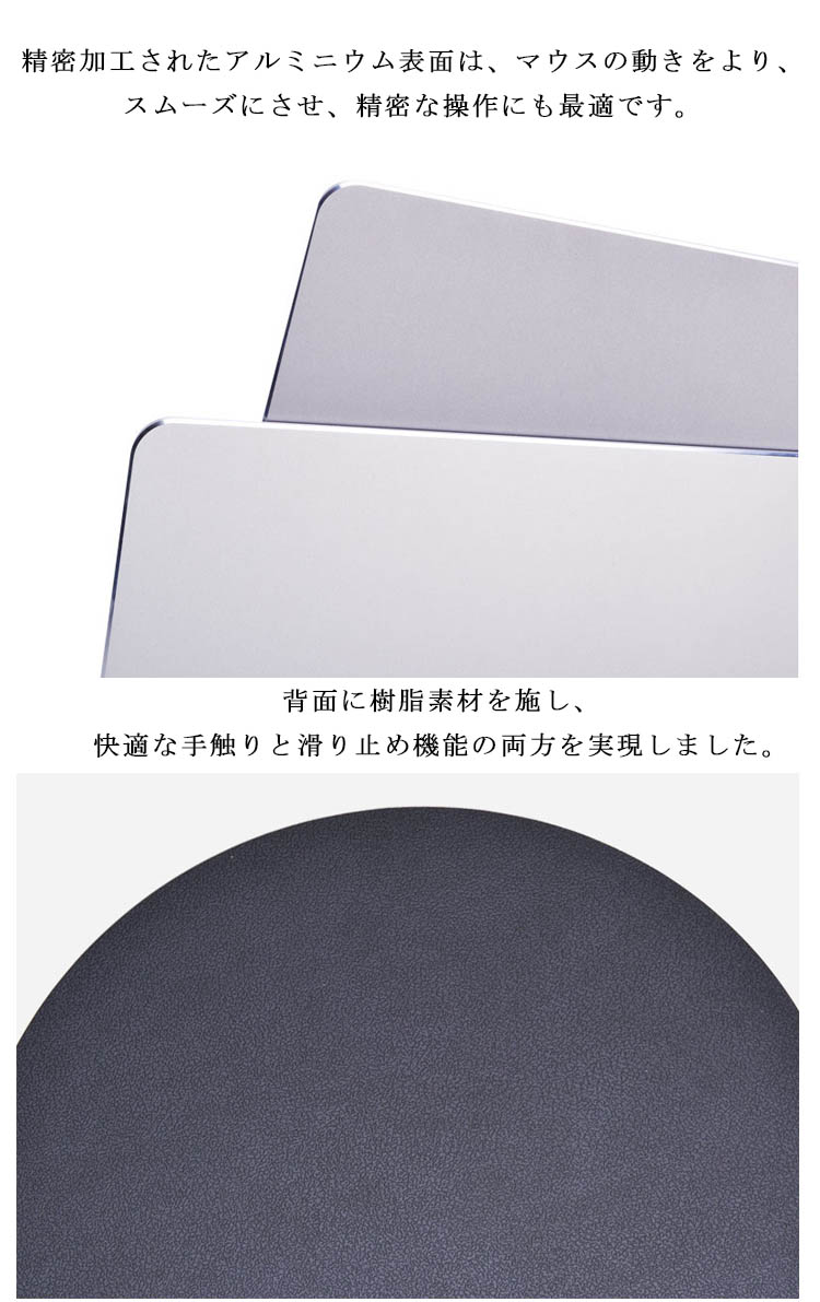 | 洗練された上質なデザインとアルミ合金でオフィスのさり気ないオシャレを演出します。背面に樹脂素材を施し、快適な手触りと滑り止め機能の両方を実現しました。表面の特殊加工でスムーズなマウス操作が可能。軽量極薄加工で持ち運びにも便利 | |