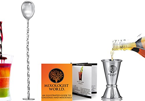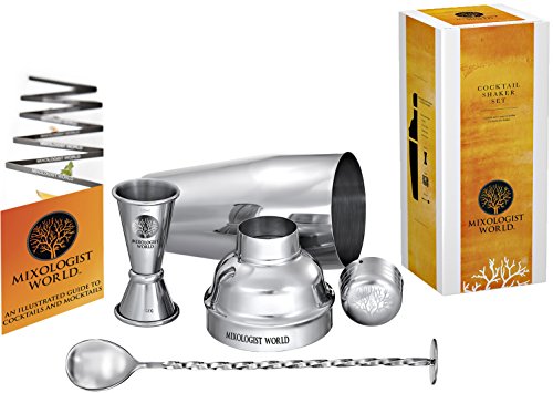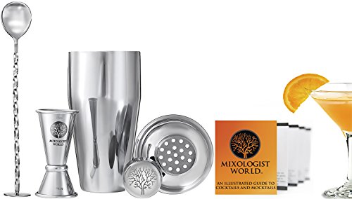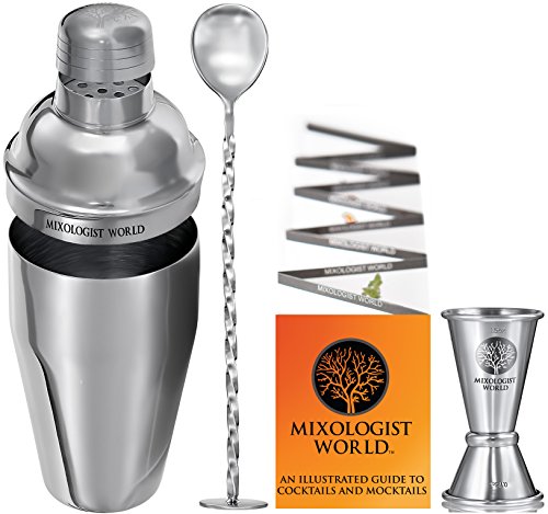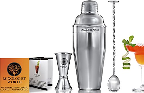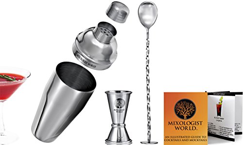 - FEATURES: Mixologist World 3 pieces stainless steel cocktail shaker set includes a large 24 oz 700 ml boston tin that can hold up to three drinks with a built in strainer lid /a beautiful twisted mixing bar spoon / a premium double size 1.5 / 0.75 oz measurement jigger tool / plus an Illustrated Guide to Cocktails or Mocktails recipes.