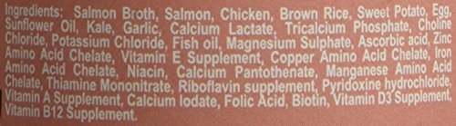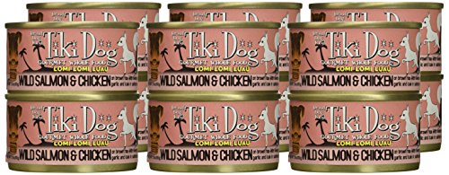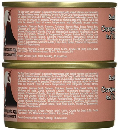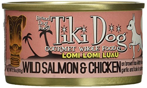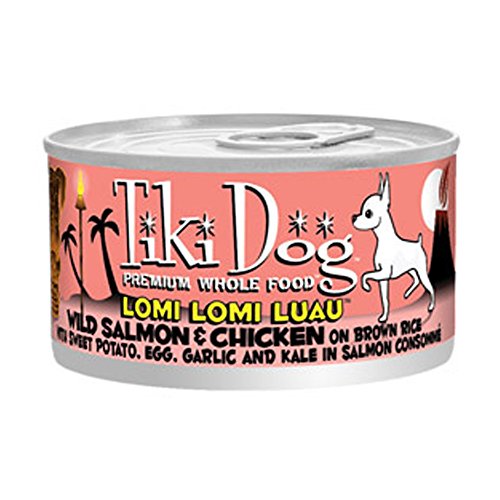 Tiki Dog Gourmet Whole Food Brand Dog Food Lomi Lomi Luau is shredded wild caught vancouver salmon and chicken breast on brown rice topped with sweet potato egg garlic and kale prepared in salmon consomme for a low grain gravy free one percent carb meal. Complete and balanced diet for all life stages feeding 2% of body weight per day to maintain weight. Great to feed solely or to supplement a dry food diet by adding the missing moisture and boosting the necessary protein and fat levels missing from kibble.Feature
