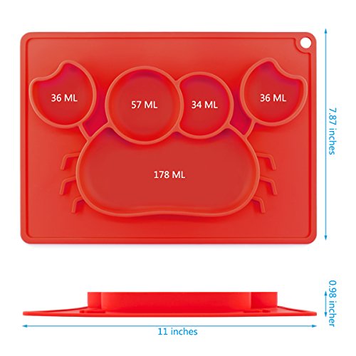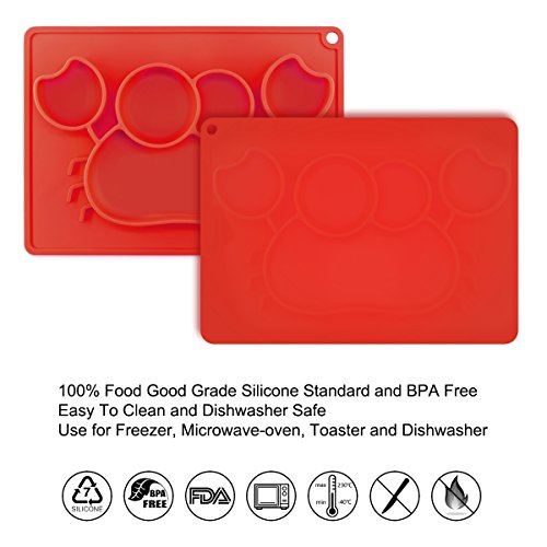 -. Feature : Adorable Silicone Place mat --Big Crabs design, has big areas to use, designed for babies and older kids, fits most high chair trays / Safe Baby Bowl--made of high quality food grade silicone, BPA free,heat-resistant mat,Nontoxic / Non-Slip Placemat-- it creates an automatic suction that won't allow your kid to pick up the plate and perform magic / Easy to Clean and Dry Fast --Super easy to clean with warm soapy water, dishwasher safe, microwave oven safe / Raised Edges Contains Messes--Get your baby plate today, make mealtime less about mess and more about fun