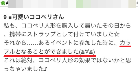 ○あゆのカバンに!! ![]() ○ジャニーズ亀●クンの携帯に!! ○ジャニーズ中●優馬クンのカバンにも ![]() 現役バリバリの 有名人認定 開運アイテム ↓↓↓ その為 一切の広告活動なしに 『ココプリすごい!』 各種SNSで 口コミ殺到中!! ![]() Tw●tter でホットワード急上昇 #ココペリ#幸運の人形#彼氏出来た ![]() 「一体この人形はなに!?」 「カワイイwてか欲し~!!」 ![]() 『とにかく願いが叶う』と… 次々にリツイート祭り 通常のお守り 開運アイテムとは 一 切 違 い 性別・年齢 国籍・年収 一切関係なく 実際に ほとんどの方が
