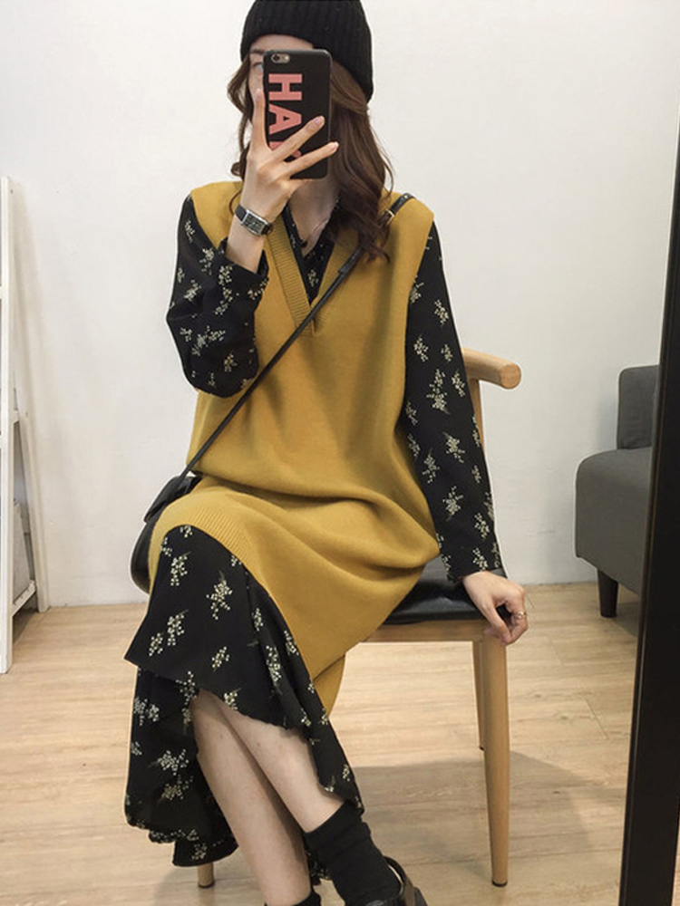重ね着 花柄 ワンピース ニットベスト 2点セット 長袖 ロング セットアップ