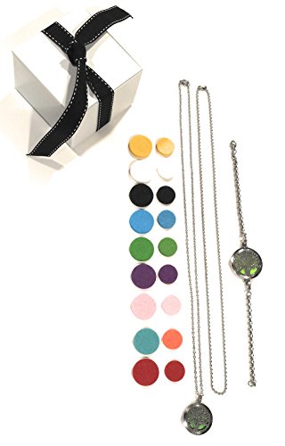 WHAT YOU GET: 1 - 25mm necklace pendant, 1 - 30mm bracelet with a total length of 8.6", 1 - 24" flat cable chain, 1 - 24" ball chain, 20 washable refill pads in 6 different colors and 1 insert with instructions beautifully packaged in a white gift box tied with a ribbon ready to be given to that special person or loved one.