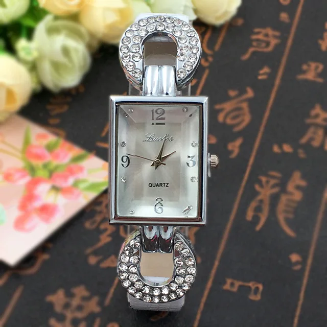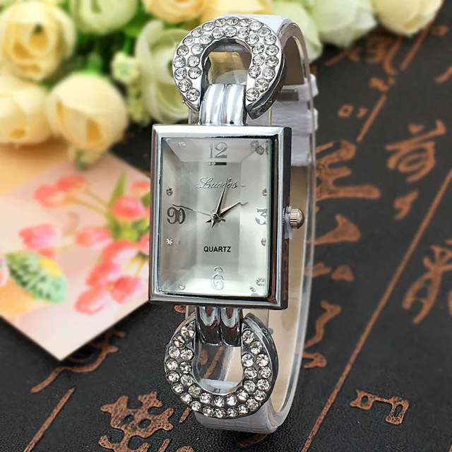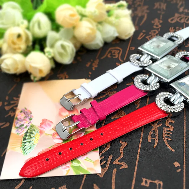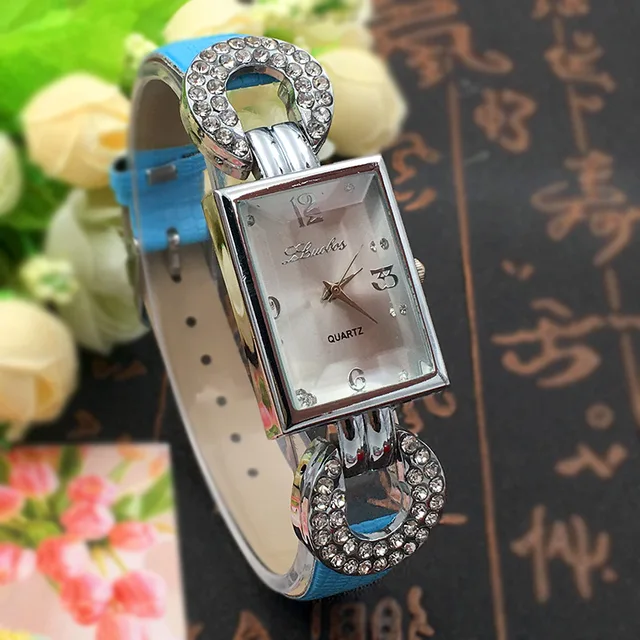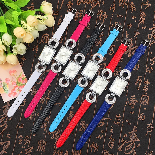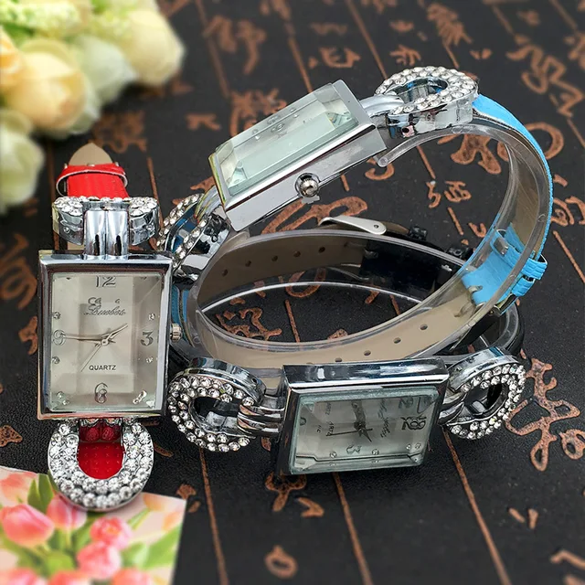 새로운 패션 여성 여성 가죽 팔찌 시계 다이아몬드 레트로 빈티지 석영 직사각형 볼록 표면 다채로운 시계 LN127