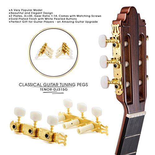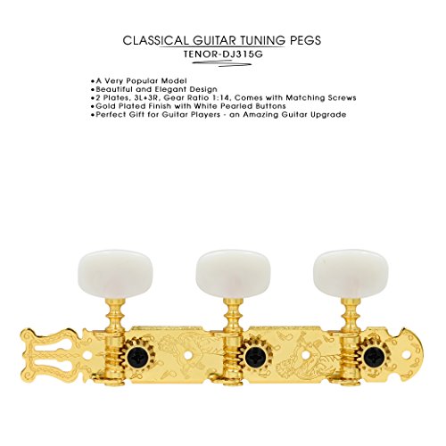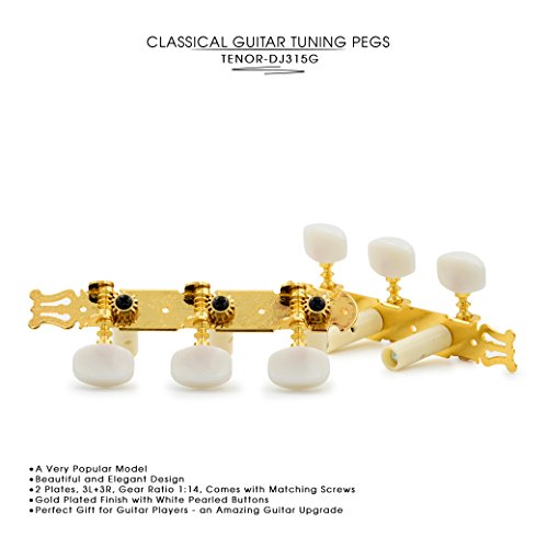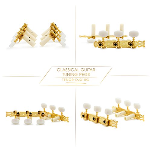 DJ315G TENOR Classical Guitar Tuners, Tuning Key Pegs/Machine Heads for Classical or Flamenco Guitar with Gold Plated Finish and White Buttons.