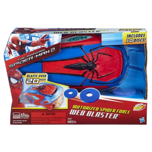 The Amazing Spider-Man Spider Force Web Blaster is built using Nerf technology fit for a hero's rapid-fire reflexes! Load up to 5 foam discs into the motorized chamber, aim, and fire! The web blaster automatically loads the next shot, so you can keep blasting targets over 20 feet away! Blast discs with a simple pull of the trigger to defeat the bad guys like The Amazing Spider-Man.