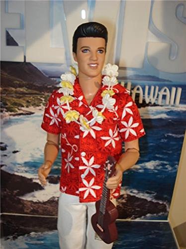 One of Elvis Presley's most successful movies was 1961's Blue Hawaii. The film featured The KingTM as an ex-G.I. turned tour guide surrounded by an exotic paradise, exciting music, and gorgeous girls. Elvis in Blue Hawaii doll wears a Hawaiian print shirt, white pants, and a yellow and white floral lei around his neck. Signature Elvis face sculpt with curled lip smile make this doll all the more charming. "Ukelele" included. Designed by Linda Kyaw. Vintage Reproduction by Bill Greening.Feature