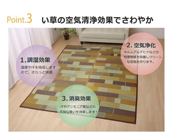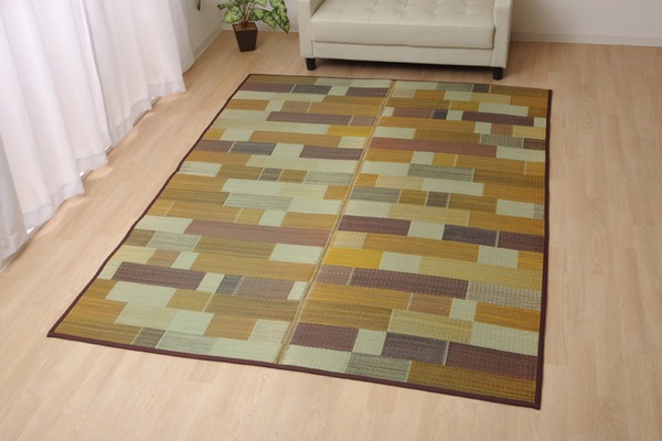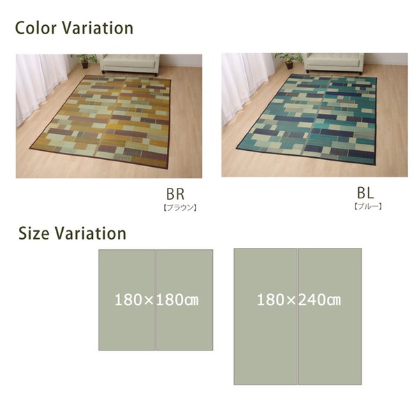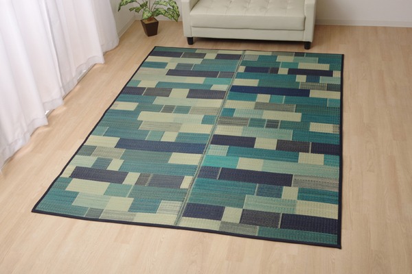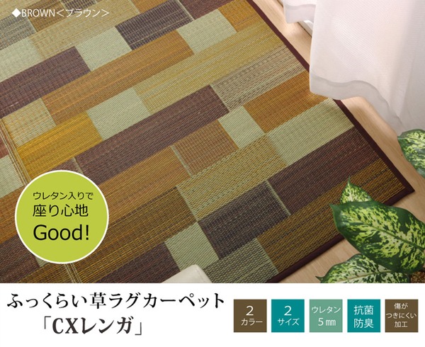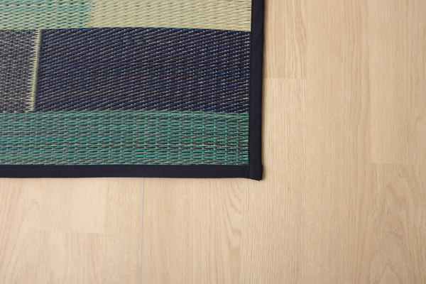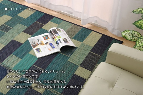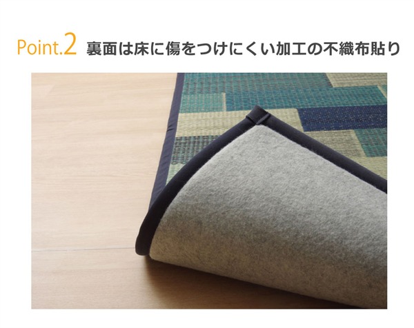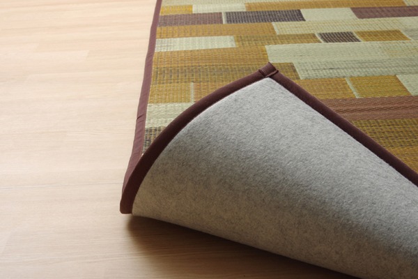 通常商品レンガをデザインしたい草ラグです。中材にはウレタンフォームを5mm使用し、ふっくらとしたふみ心地に仕上げました。フローリングでも底付き感を軽減してくれます。またい草には空気の自然浄化作用、湿度の調節作用などがあります。こちらの商品はい草に青森ヒバ加工を施しています。(抗菌、防臭効果)
