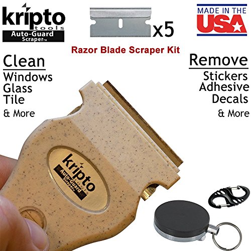 Tan Razor Blade Scraper Kit Paint, Tint, Adhesive, Residue, Silicone, Stickers, Decals on Glass & Hard Surfaces - Includes 1 Scraper + 5 Blades + Rectactable Clip Tether Reel + S-Biner Clip
