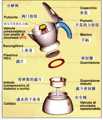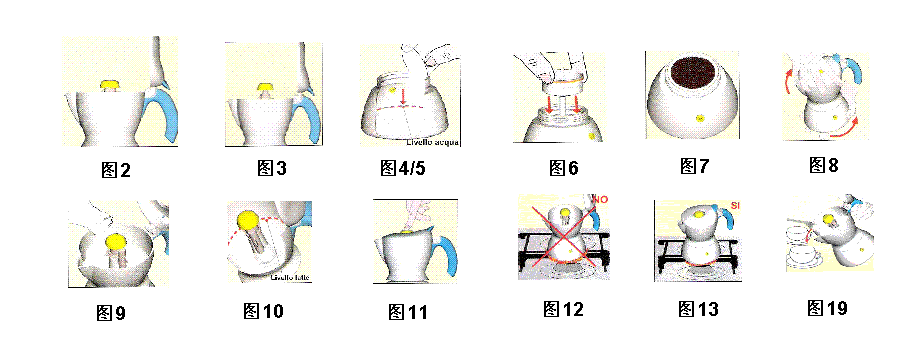 使用前:根据图1仔细检查所有的零部件是否齐全,并且都安装在正确的位置。前三次(不少于三次)烧煮的咖啡必须丢弃不宜饮用。必须仔细阅读使用说明。为了达到最好的使用效果,请遵照使用方法和容积高度指示。根据控制图2和图3中压力阀按钮位置的高低,来达到两种不同口味的咖啡烧煮。图2中,制作卡布奇诺咖啡时,压力阀按钮的位置向下;图3中,制作拿铁咖啡时,压力阀按钮的位置向上。