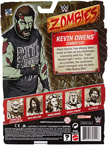 -. Binding : Toy -. Brand : WWE -. EAN : 0887961395426 -. Feature : Bring home the action of the WWE! / Recreate your favorite matches / Pose him in a menacing stance, pair him with another figure to battle or create total mayhem by adding multiple figures (each sold separately, subject to availability) / Features articulation, amazing accuracy and authentic Superstar details / Let the WWE mayhem begin! -. Label : Mattel -. Manufacturer : Mattel -. Model : DXG69 -. MPN : DXG69 -. PackageQuantity : 1 -. PartNumber : DXG69 -. ProductGroup : Toy -. ProductTypeName : TOYS_AND_GAMES -. Publisher : Mattel -. Studio : Mattel -. Title : WWE Zombies Kevin Owens Figure -. UPC : 887961395426 -. Warranty : 1 year warranty against manufacturer defects
