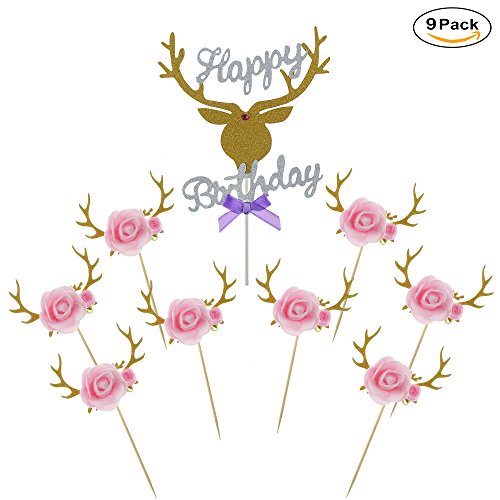 - Deer Themed Cupcake Cake Decorating Supplies: Deer themed party supplies including 1 gold deer head with silver "happy birthday" monogram cake topper, 8 deer antler with flower cupcake toppers picks, a total of 9 counts.