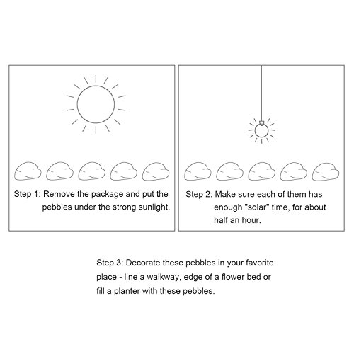 - Approximately 100 pieces of non-toxic glowing resin pebbles per bag. These pebbles absorb strong sunlight for about half an hour during the day and light up at night. They will glows for up to 2-3 hours.