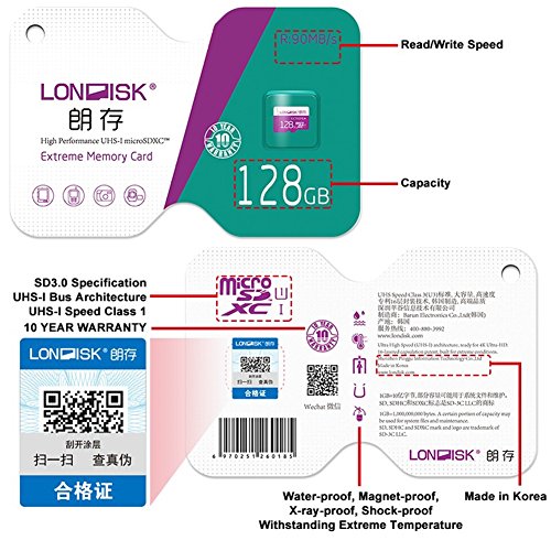 Features of Londisk Micro SD Memory Card: 1. Transfer speed: up to 90mb/s 2. Flash Memory Type: SDXC card 3. Speed Class: Class 10 4. Video form: 1080p Ultra-HD Full HD video recording and playback, 4K video playing