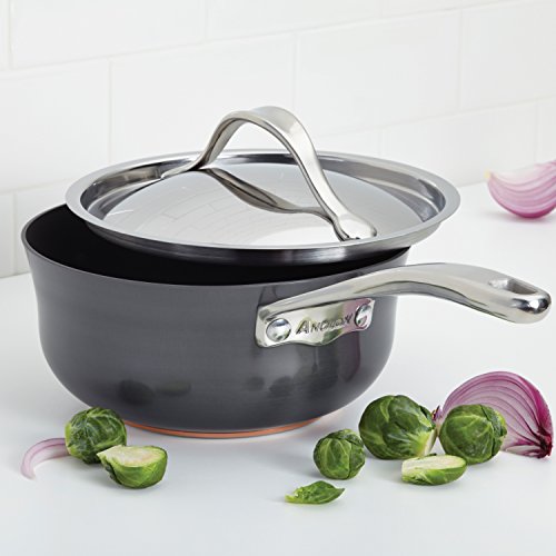 This Anolon Nouvelle Copper hard-anodized 2.5-Quart saucier is a ‘must have’ for any kitchen. Its wide, shallow design and curved side edges make stirring efficient, so that any sauce will cook evenly. This pan also allows for a quicker boil for sauce reductions or a slow gentle simmer to cook ingredients thoroughly. The copper core double full cap base paired with durable restaurant tested Autograph 2 Nonstick ensures even heat distribution, enduring food releasing performance and easy cleaning.Feature