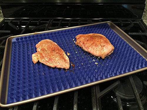 SMART INNOVATIVE DESIGN: Unlike most similar oven mats on the market featuring a flat surface, DRAKS ground-breaking cooking mat raised CONE surface enhances heat circulation underneath your food, while it keeps oil and fat away from it, saving you time on your daily meal prep and providing you with well-cooked, crunchy food or pastry on both sides!