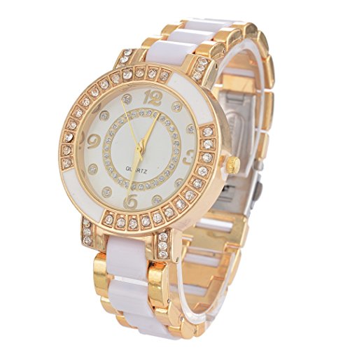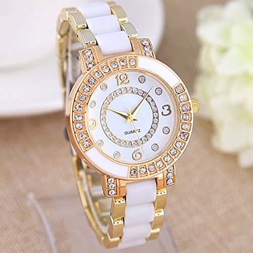 Souarts Womens Gold Color Ceramics Rhinestone Quartz Wrist Watch White