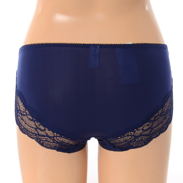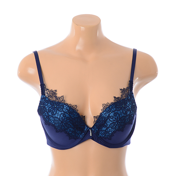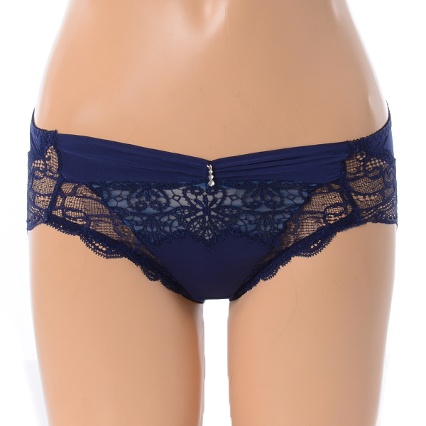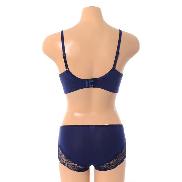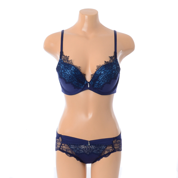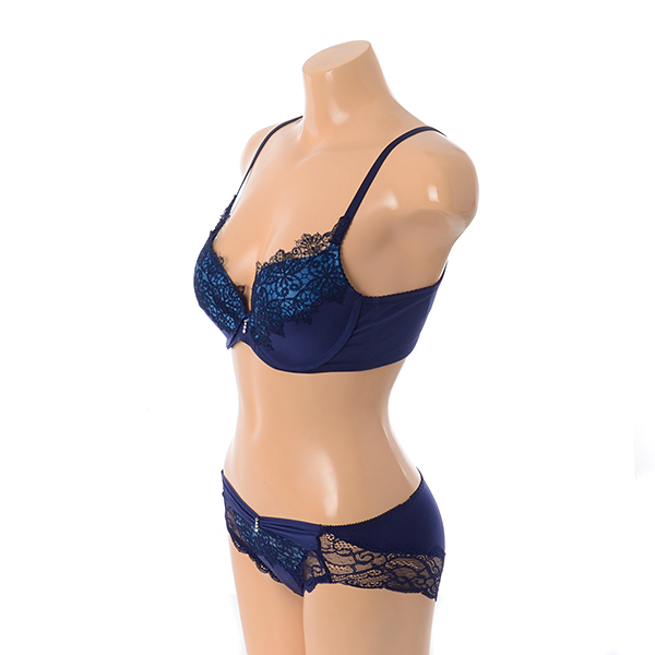 네트에 캐미컬 자수와 큐빅을 매치하여 편안한 피팅감에 화려한 느낌을 더한 3/4컵 몰드브라 레이스팬티세트 네이비 컬러입니다.