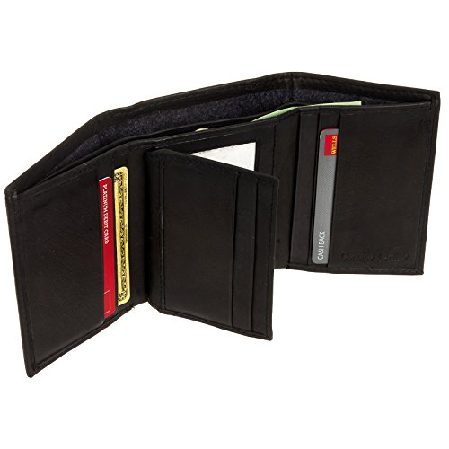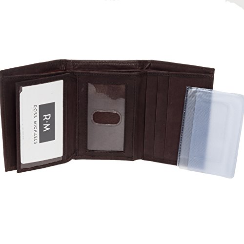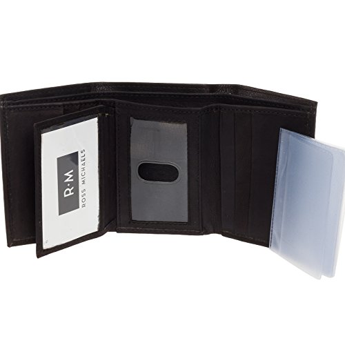 -. Binding : Apparel -. Brand : Ross Michaels -. Department : mens -. Feature : RFID BLOCKING TECHNOLOGY - Most modern credit and debit cards feature integrated RFID technology for quick-paying convenience. Unfortunately, "electronic pick-pockets" have the ability to simply scan the outside of your wallet, stealing your personal information. This wallet now features RFID blocking protection that will shield your credit card, passport, and driver's license information from being pulled or even deleted by electronic thieves. / HANDCRAFTED QUALITY - Soft genuine leather construction is meticulously stitched together to bring you a durable wallet that will stand the test of time. / PLENTY OF STORAGE - 8 card slots, a utility pocket, and dual currency pocket give you plenty of space to store the necessities / FOR THE MAN ON THE GO - The flip-out pass case holder with thumb-glide ID window makes it easy to find metro and bus passes / PRODUCT SPECIFICATIONS - Measures 4.5" x 3.5" x 1" (when closed) -. Label : Ross Michaels -. Manufacturer : Ross Michaels -. MPN : Bacci -. PackageQuantity : 1 -. PartNumber : Bacci -. ProductGroup : Apparel -. ProductTypeName : ACCESSORY -. Publisher : Ross Michaels -. Studio : Ross Michaels -. Title : Ross Michaels Men's Top Grain Cowhide Leather RFID Trifold Wallet