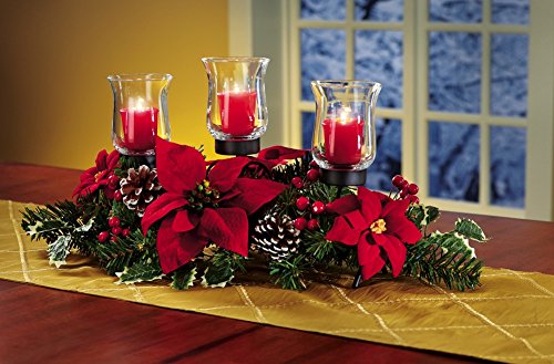The season's favorite centerpiece is an "evergreen" arrangement of faux poinsettias, winter greenery and pinecones. Comes complete with 3 glass holders for votive candles or tealights (not included). Plastic/ glass. 20"L x 9"W x 9 1/4"H.